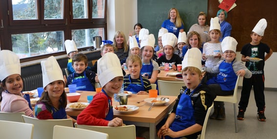 Kurz vor den Herbstferien erlebten die Klassen 3a und 3c mit ihren Klassenlehrerinnen Christine Haas und Beate Amberg einen ganz besonderen Schultag. Unter dem Motto "Mehr bewegen - besser essen" veranstaltete die EDEKA Stiftung in Kooperation mit EDEKA Lauber einen Projekttag zur Ernährungsbildung. Perfekt vorbereitet und ausgestattet kam das Team schon sehr früh am Morgen in unsere Schule, denn die Themen Ernährung, Bewegung und Verantwortung standen auf dem Plan. Nach dem gemeinsamen Frühstück beschäftigten sich die Kinder mit ausgewogener Ernährung, später folgten auch komplexere Umweltthemen wie "Gefährdung der Meere" und "Nachhaltige Fischerei". Ergänzt wurde das Lernen durch Bewegungspausen und das gemeinsame Kochen eines leckeren Mittagessens rundete den Schultag ab.
