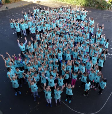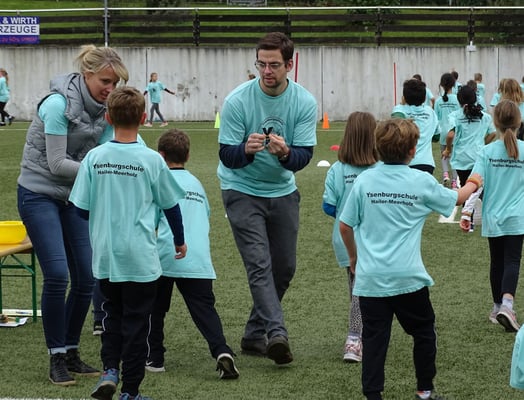 Leider hatte es in der Nacht vor dem Lauf stark geregnet und so trafen sich unsere Schulsportleiterinnen Melanie Rehn und Heike Steinleitner schon im Morgengrauen, um eine etwas veränderte Laufstrecke auf dem Sportplatz in den Bereichen abzustecken, die schon abgetrocknet waren. Glücklicherweise hielt das Wetter und so machte der Jahrgang 2 gemeinsam mit den Schülerinnen und Schülern der Intensivklasse den Anfang. In der Pause fanden sich dann alle Kinder und das Kollegium auf dem Schulhof ein und ergaben ein tolles Bild, denn alle trugen die vom Förderverein neu angeschafften Schul-Shirts.